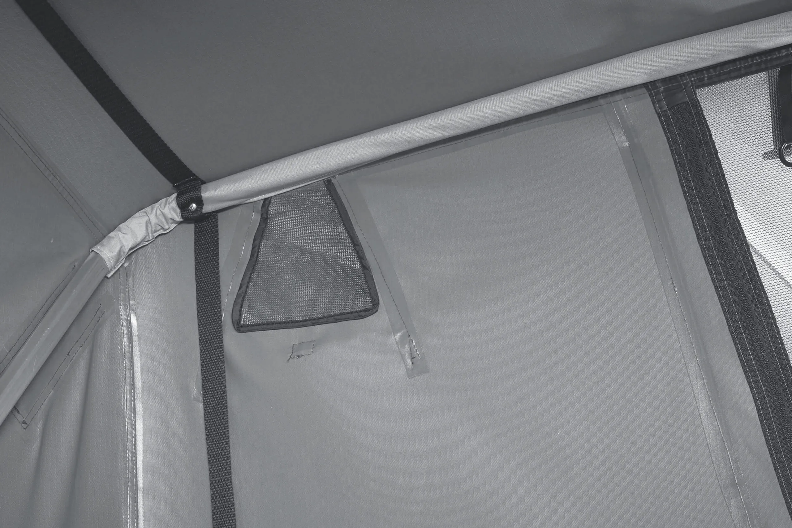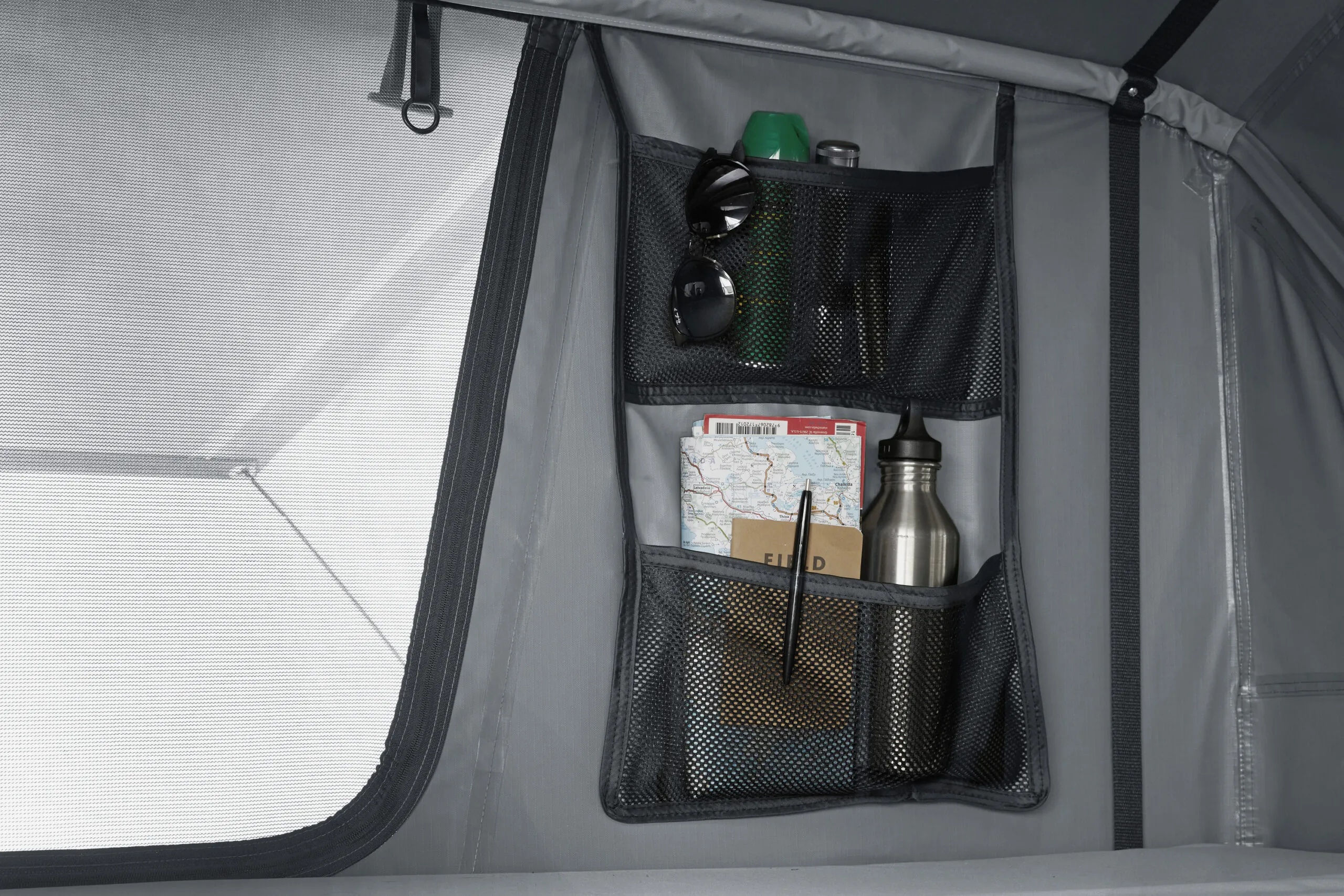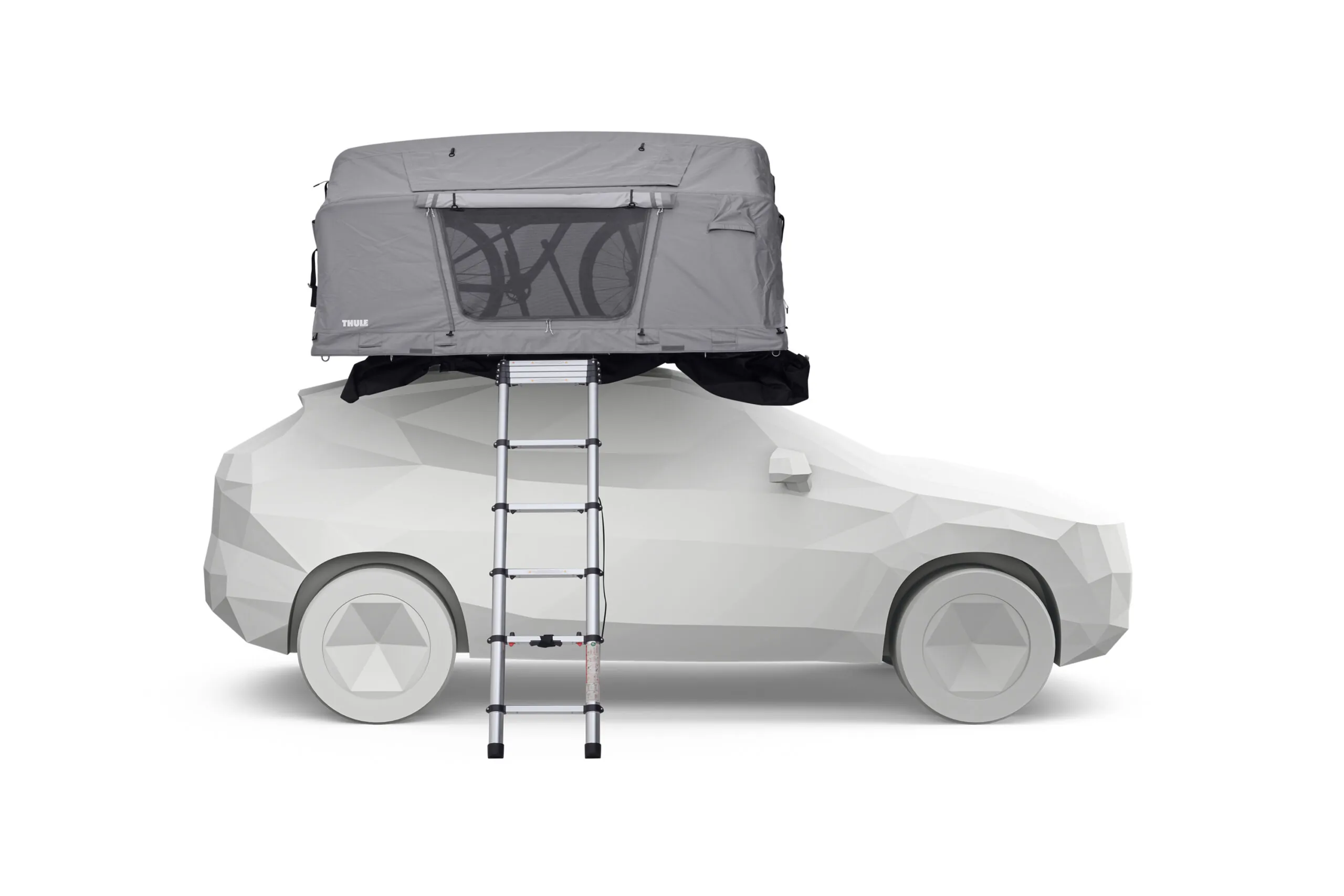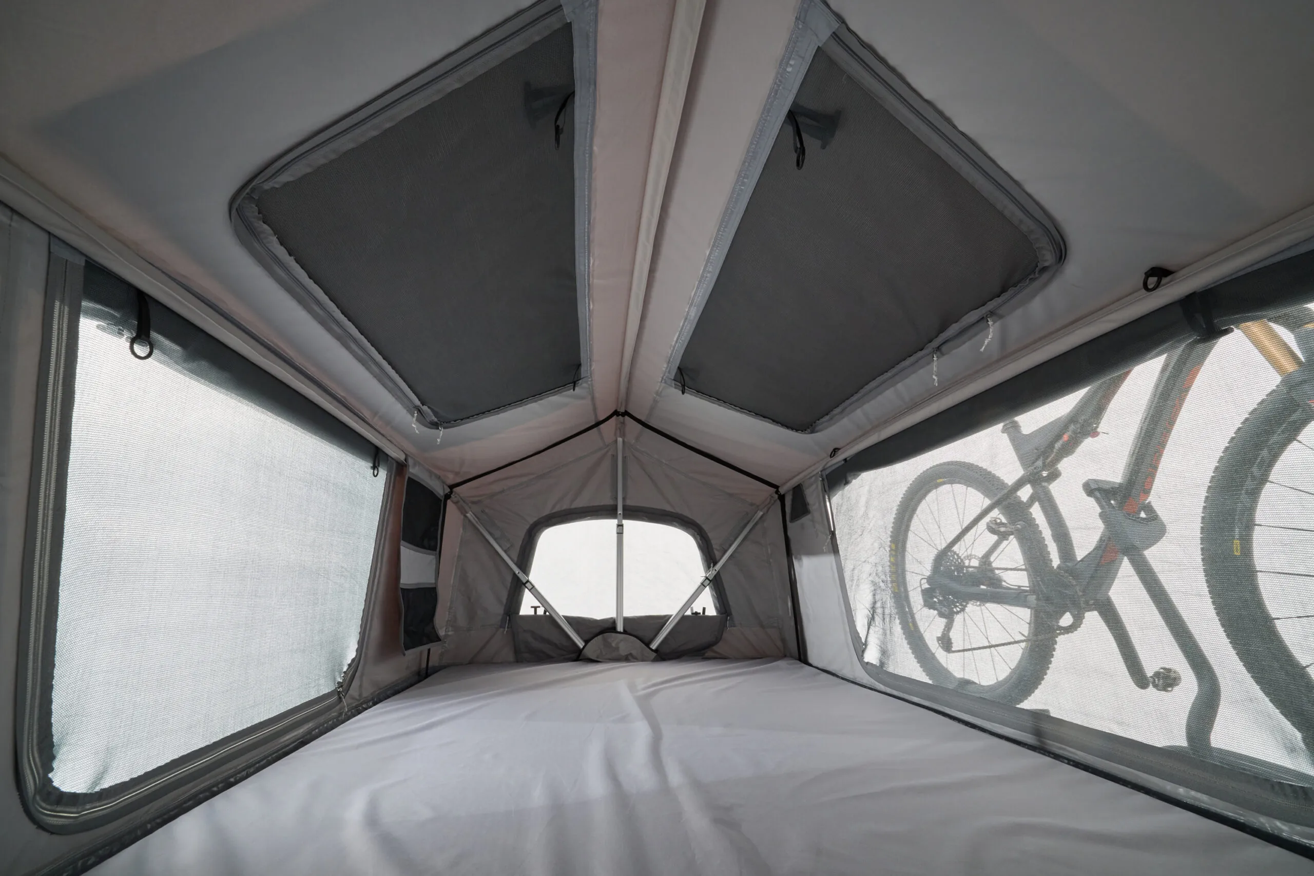 Daktent die slechts de helft van de ruimte op je dak inneemt, zodat er waardevolle ruimte overblijft voor fietsen, kajaks en andere uitrusting, maar op de camping volledige comfort biedt.